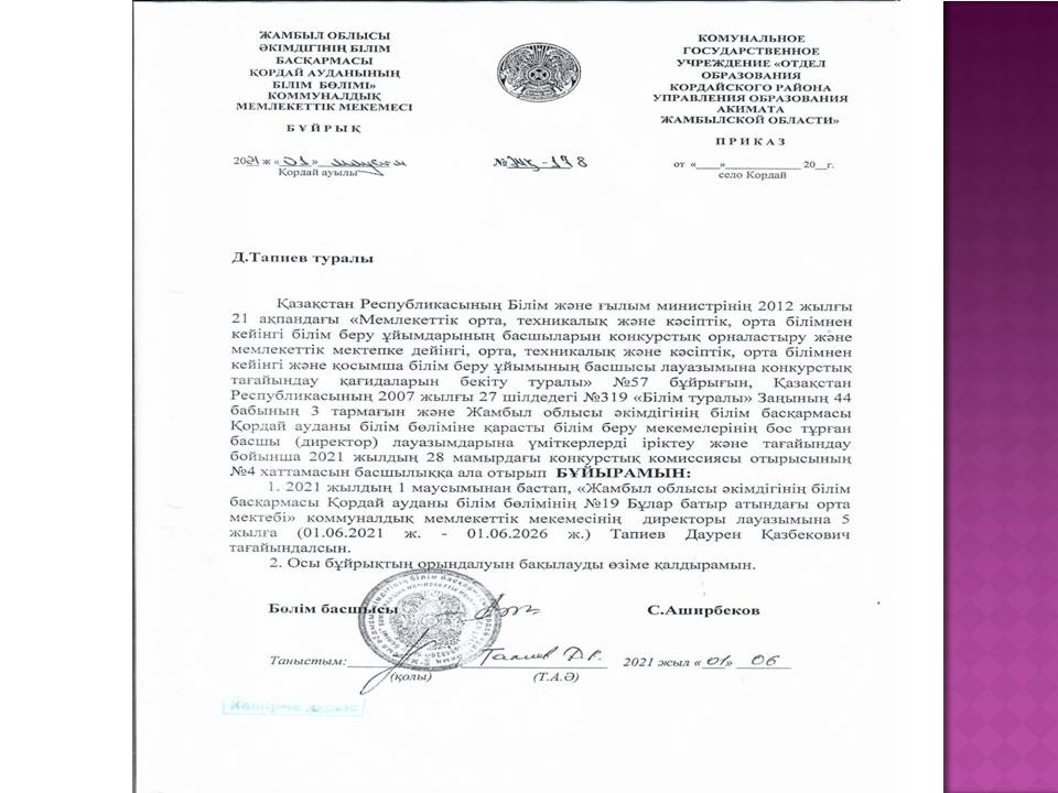 Назначение директора Тапиева Д.К. » СШ №19
